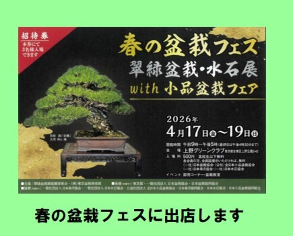春の盆栽フェス(翠緑盆栽・水石展with小品盆栽フェア)に出店します。