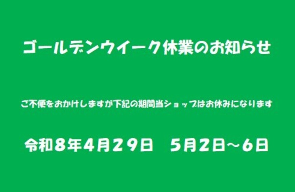 4月29日、5月2日~6日まで当ショップはお休みとなります。商品の発送は4月30日、5月1日は可能です。それ以降のご注文は5月7日以降となりますのでご了承ください。また、商品のお問合せ等のご対応も同様になります。お客様にはご不便をおかけいたしますが何卒ご理解ほど宜しくお願いいたします。